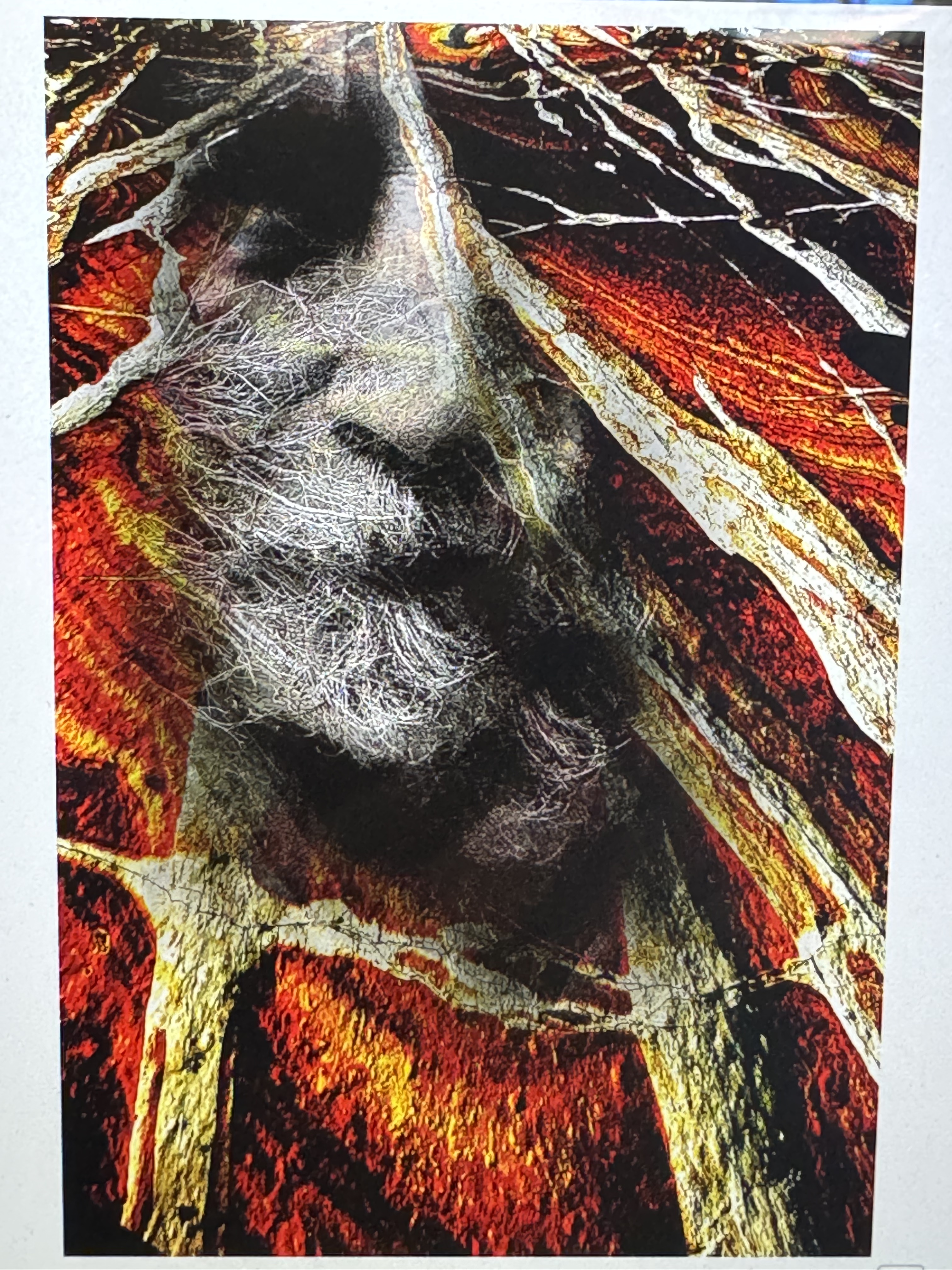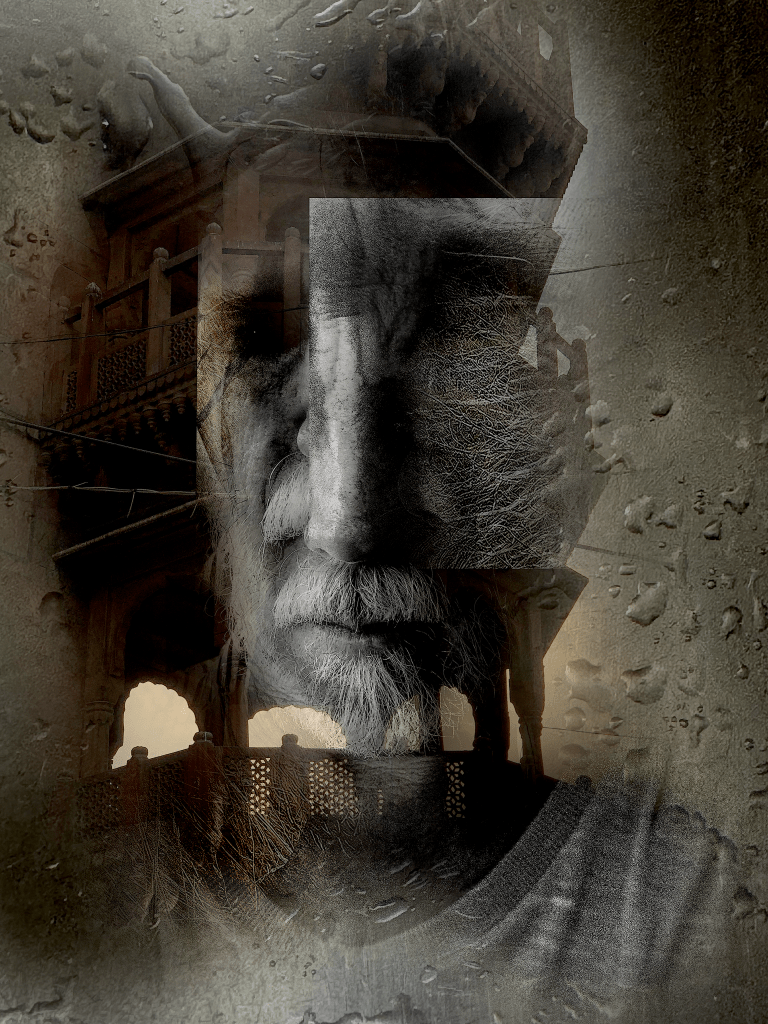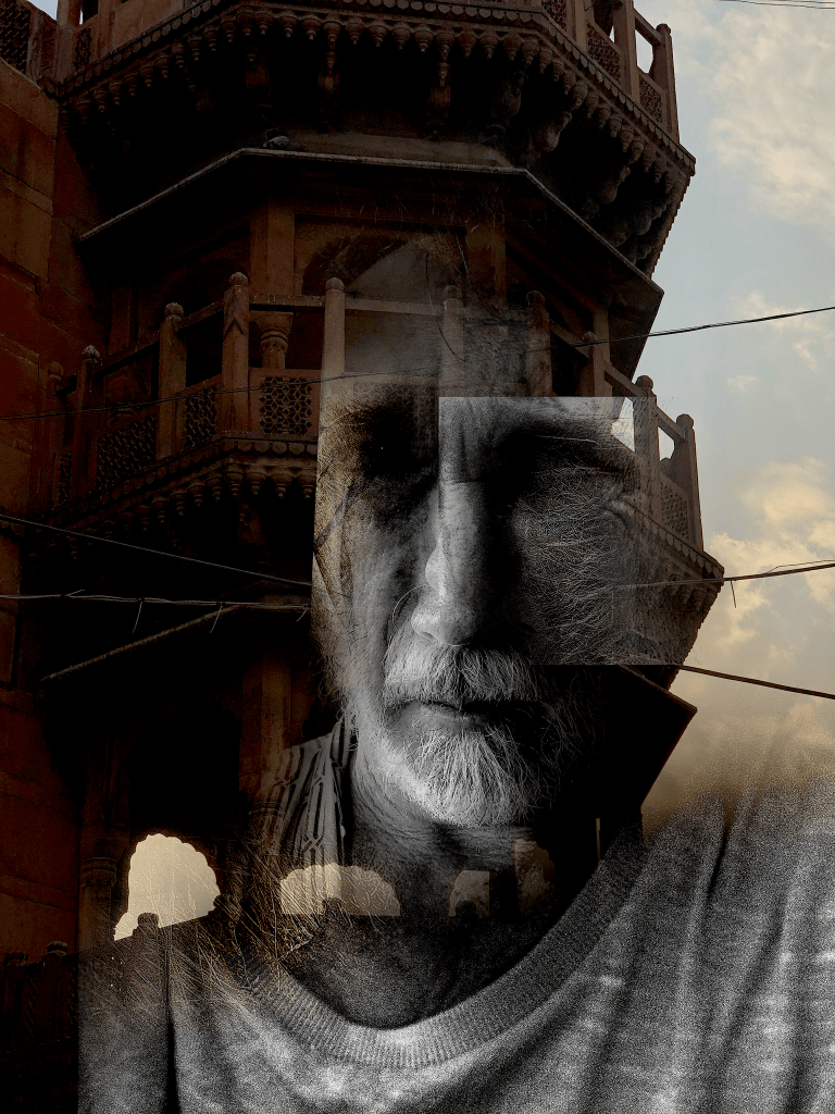I have worked a lot over the last couple of months on some material I have worked with from India, and here you can see me collaging myself onto backgrounds. I love the way the background can blend partially with the face or figure, enhancing it somewhat.