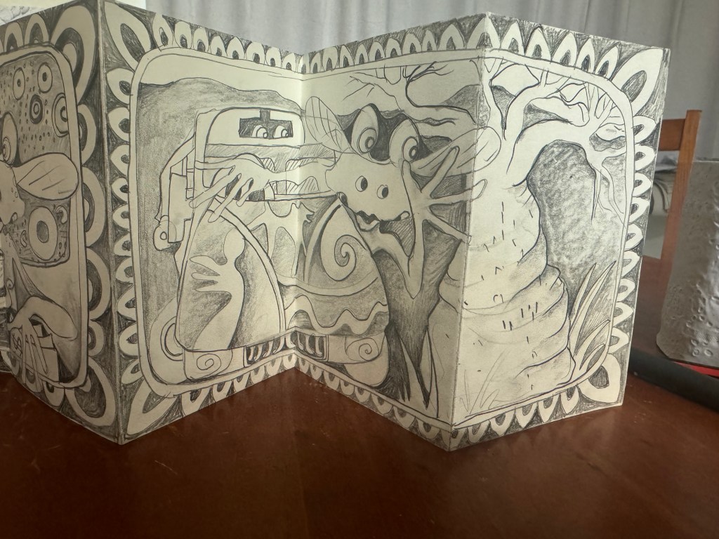 I make these concertina books up usually following a theme and here we have our journeyman frog on his way to discovering different forms of roots. These small books have about 40-odd pages that join up and I love the way that linear narratives can be developed and expanded. It is my way of doodling also, as I am able to work the themes in a fashion that one feeds into the other.