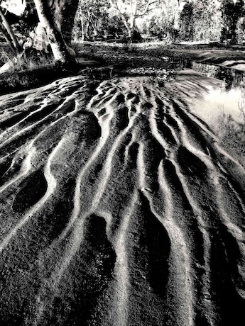 Dogs are amazing as they are an ideal study to work with on the beach. They cast such beautiful shadows, and have the ability to animate a space very quickly. We have to be very careful here as crocodiles also like dogs, but for a very different reason. But every time we take a dog to the water, there is always an interesting dance. My friend Dave’s dog, Noodles, would love this beach and the freedom it affords. Noodles and I have spent a long time at the other end of the territory outside Alice Springs at the Claypans, and many a watery reflection have we shared together on that hallowed ground.