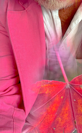 I took on the road with me, my Pink Suit made by my daughter, as this was destined to feature in every place we went to. Here you can see the single maple leaf blown up in proportion against the suit, where I am exploring the notion of degeneration, aging and Wabi Sabi, as I was in Japan where the photo was taken. This is the art of imperfection and yet was deemed perfect for the shot. I work a lot using digital collage, and this is part of my story telling.